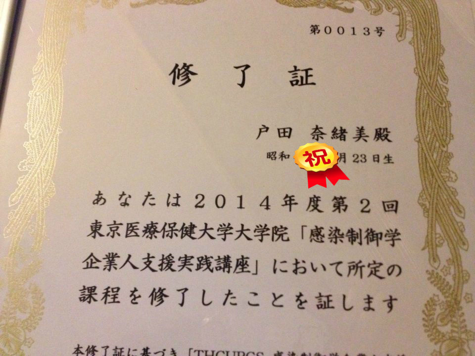 皆様にご報告です。昨日、感染制御学講座を無事に修了いたしました