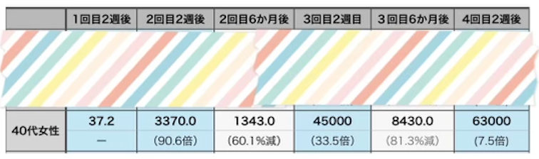 3回目半年で81%抗体価が減っていましたが、4回目のブーストで7.5倍に増えました。この増減の幅も個人差がかなりあるようです。